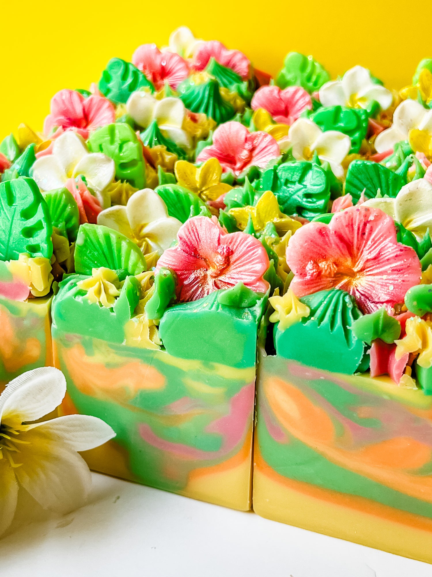 Transport yourself to a tropical getaway with our Island Oasis cold process soap! Scented with an enticing blend of mango, pineapple, coconut, banana, jasmine, and musk.